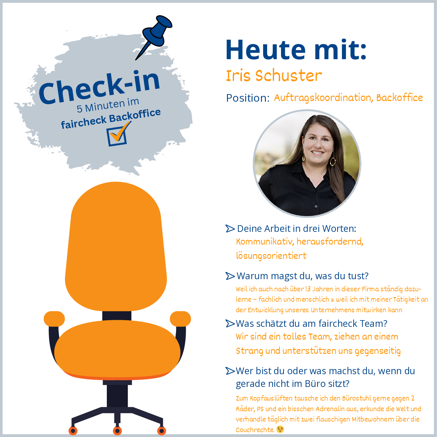 Check-in. Der faircheck 5 Minuten-Talk im Backoffice mit Iris Schuster