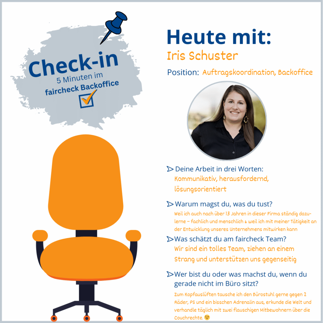 Mit kurzen Portraits gewähren wir Einblicke in den jeweiligen Arbeitsalltag bei faircheck: Mitarbeitende und Partner erzählen, was sie mit ihrer Arbeit verbinden, was sie besonders mögen und was Sie am Team bzw. in der Zusammenarbeit mit faircheck besonders schätzen. Außerdem erzählen sie, wer sie sind und was sie machen, wenn sie gerade nicht bei faircheck im Büro sitzen bzw. für faircheck österreichweit unterwegs sind.